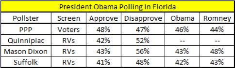 At the state level, four pollsters recently polled the Florida electorate at roughly the same time. This is as good state as any to poll, since it has been a swing state for the past five elections. If President Obama loses Florida, it becomes very tough (though not impossible) for him to hold the presidency.